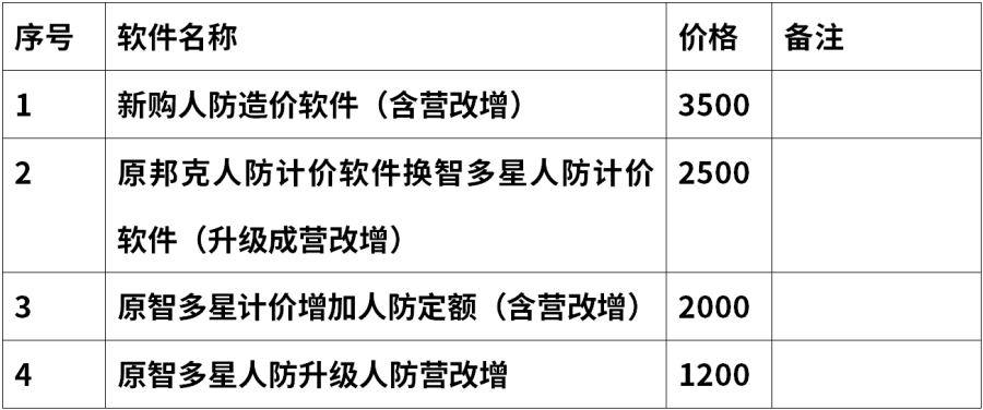 三、 收費說明:人防軟件銷售價格及升級人防營改增價格如下: