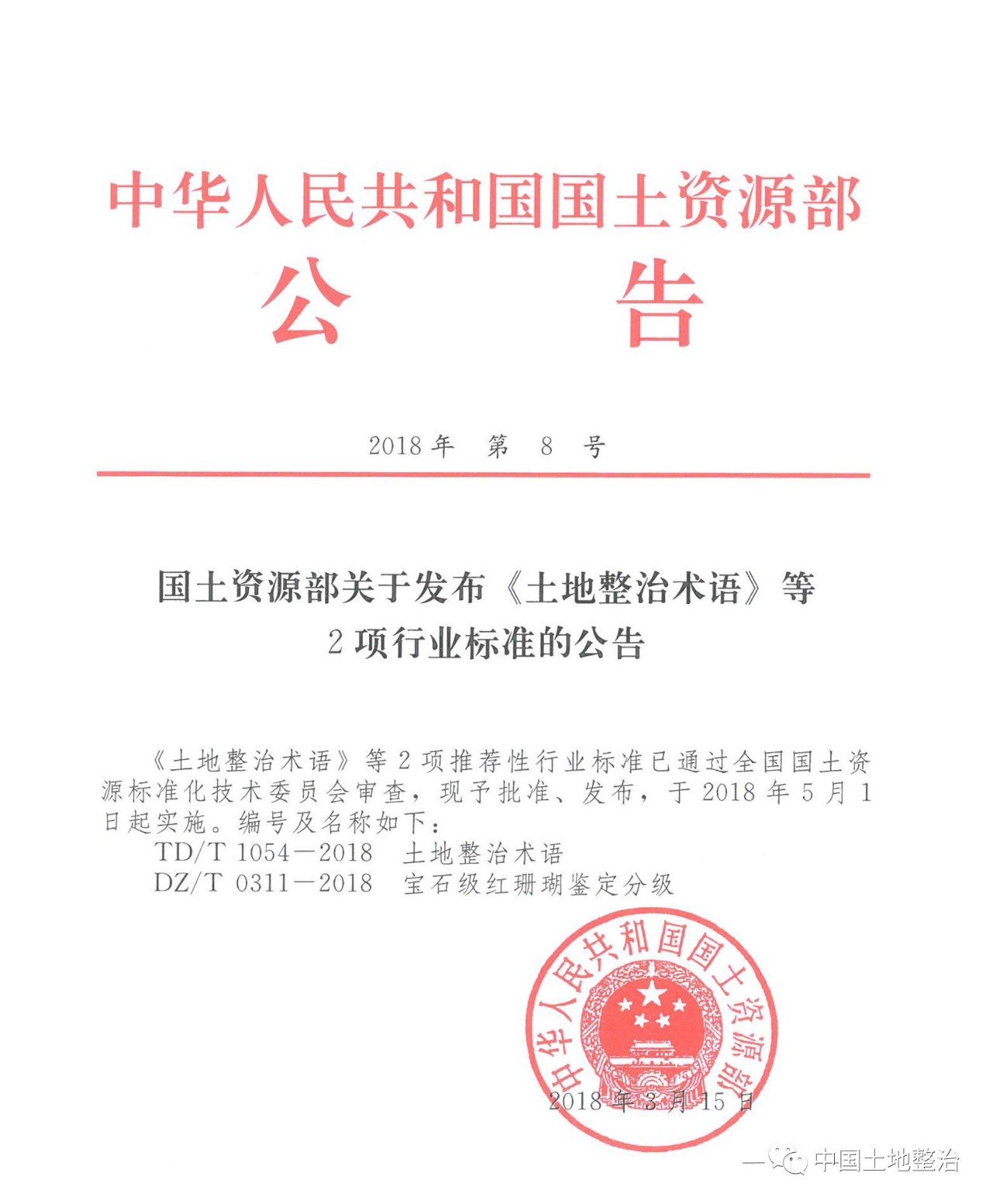 2018年3月15日,國土資源部印發(fā)2018年第8號(hào)公報(bào),批準(zhǔn)、發(fā)布《土地整治術(shù)語》(TD/T 1054-2018)行業(yè)標(biāo)準(zhǔn),于2018年5月1日起實(shí)施。這是繼“土地整治工程技術(shù)人員”納入國家職業(yè)分類大典(2015年,GBM20237L)、“土地整治工程”專業(yè)納入教育部本科專業(yè)目錄(2016年,082306T)、“土地整治服務(wù)”納入國民經(jīng)濟(jì)行業(yè)分類新國標(biāo)(GB/T 4754-2017,N-79-791),土地整治行業(yè)又一件具有里程碑意義的重大事件,標(biāo)志著土地整治技術(shù)體系和業(yè)務(wù)體系進(jìn)一步建立健全,土地整治學(xué)科建設(shè)和業(yè)務(wù)建設(shè)取得了關(guān)鍵性突破。