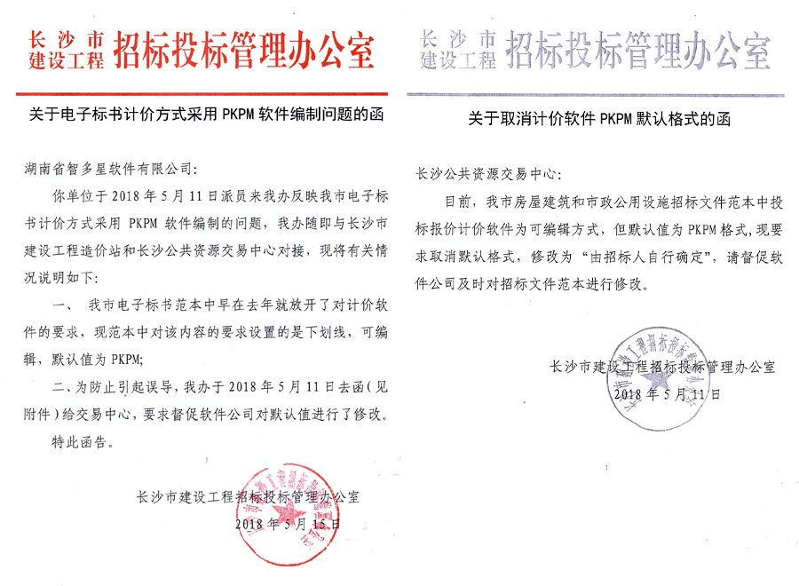這種有悖公平、公正市場原則的做法,既損害了其他造價軟件公司的利益,更迫使建設工程造價從業(yè)單位增購PKPM軟件,大幅增加了建設工程造價從業(yè)單位的負擔,社會影響十分惡劣。湖南智多星軟件有限公司作為湖南省工程造價軟件唯一一家新三板掛牌企業(yè),我們有責任替廣大造價軟件用戶和企業(yè)說話,因而我們毅然決然對這種不公平的現(xiàn)象說“不”!在2018年5月,我公司通過信函、上門的方式,積極向紀檢及相關職能部門進行投訴反饋,通過多次溝通協(xié)商,2018年5月11日,長沙市招標辦正式發(fā)函,取消在長沙市建設項目招投標過程中默認PKPM計價軟件,改為通用格式,并正式通知長沙市公共資源交易中心,要求其在標書模板上進行修改(見附件)。我公司也于2018年5月17日收到長沙市公共資源交易中心的正式通知,告知我司標書模板已修改完成。在日后的建設工程造價工作中,若再次遇到指定使用PKPM軟件的情況,歡迎向我公司反饋,我們將全力配合調查取證,并積極向上級主管部門舉報。