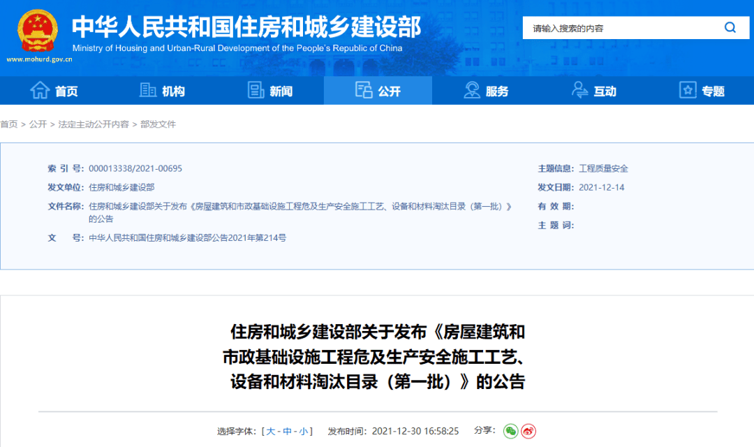 2021年12月14日,住建部印發(fā)的《房屋建筑和市政基礎(chǔ)設(shè)施工程危及生產(chǎn)安全施工工藝、設(shè)備和材料淘汰目錄(第一批)》明確: