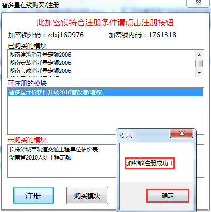 第六步:如需繼續(xù)購買其他模塊,請點擊‘購買模塊’按鈕;如無需購買,關(guān)閉對話框即可,此時您的加密鎖已成功完成2016營改增升級。