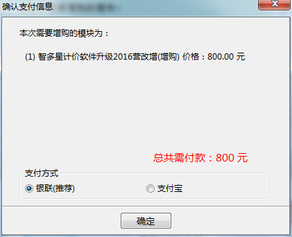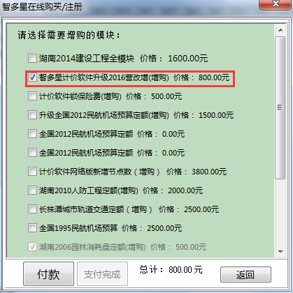 第四步:勾選”智多星計(jì)價(jià)軟件升級2016營改增(增購)“,或任意一項(xiàng)您需要購買的模塊,之后點(diǎn)擊“付款”按鈕;