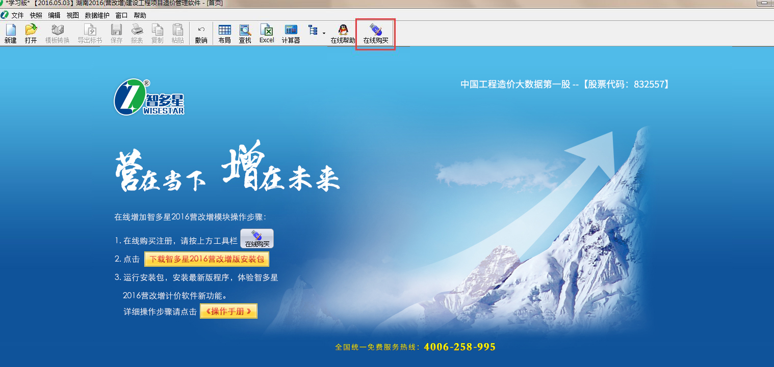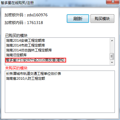 第三步:在軟件主界面,點(diǎn)擊上方“在線購買 ”按鈕(1),在未購買模塊中會(huì)出現(xiàn)“湖南計(jì)價(jià)軟件升級2016營改增(增購)”模塊,點(diǎn)擊“購買模塊”按鈕(2):